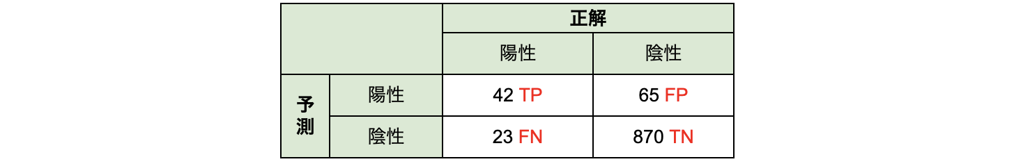 正解率=42+65+23+87042+870≒0.91適合率=42+6542≒0.39再現率=42+2342≒0.65特異度=65+870870≒0.93真陽性率=再現率≒0.65偽陽性率=65+87065≒0.07F1=0.39+0.652⋅0.39⋅0.65≒0.49