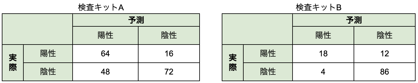 (1)の結果から、検査キットAは「適合率 < 再現率」で、検査キットBは「適合率 > 再現率」であることが分かった。