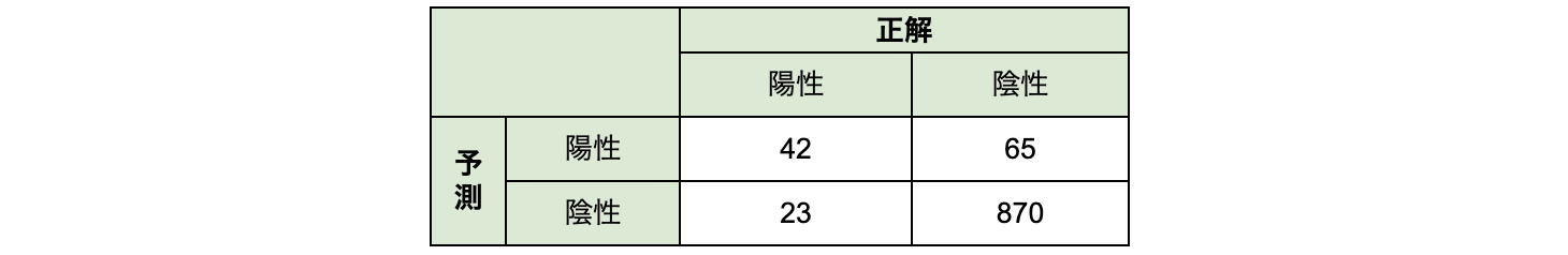 この自動選別機で1000個の果物を判定し、予測結果と正解を集計したところ以下の通りになった。ただし、「傷あり」を陽性としている。